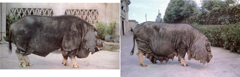 二花脸猪体型中等介于梅山猪与米猪二者之间。头大额宽、额部皱褶多、深。耳特大,软而下垂。耳尖齐或超过嘴角,形似大蒲扇。全身被毛黑色或青灰色,毛稀疏,毛丛密,毛丛间距离大,腹部皮肤多呈紫红色,也有鼻吻白色或尾尖白色的。 |