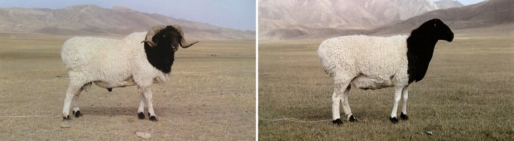体质结实,体格中等。头较窄而长,耳大下垂,公羊多有螺旋形角,母羊有角或有角痕。后躯较前躯发达。四肢较高,蹄质致密。尾属短脂尾不超过飞节。毛被属异质毛,干死毛含量较多。毛色、头和颈部为黑色,体躯为白色。 |