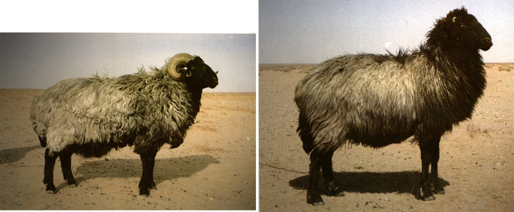 头稍长,鼻梁隆起,耳大下垂,公羊多数有角,呈螺旋形向两侧伸展,母羊多数无角,少数有小角。颈中等长。胸深体宽,尻斜。四肢结实。尾肥厚,基部宽大,尾尖呈“S”状弯曲。毛色主要为黑色,灰色、彩色较少,毛被颜色随年龄增长而变化。 |