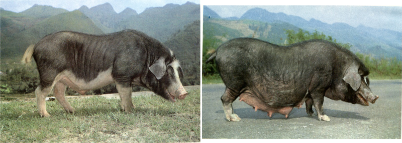 体型中等,头大小适中,额部有八字或菱形皱纹,额心有旋毛,耳较小下垂,嘴长适中,颈较短,体躯较宽深,胸部发达,背腰微凹,腹大下垂,腿部较丰满略倾斜,四肢直立,体质坚实,皮肤多皱褶。全身被毛以黑为主。 |