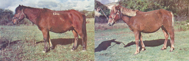 体型小而结实,头重,额微凸,颈短,鬐甲低平,背腰平直结合良好,胸宽深,尻斜,尾根低,腹圆而微收,四肢关节坚强,筋腱发达,蹄质坚固,长毛浓,距毛多,毛色一栗、骝毛为主,黑色次之。 |
