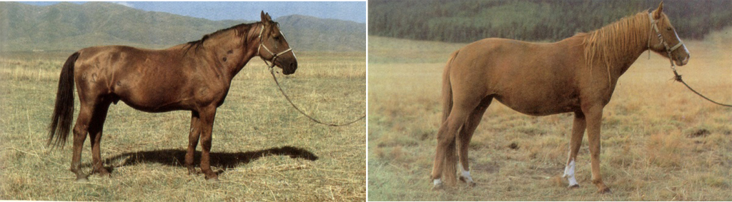 体质结实紧凑,性情温驯,结构匀称。头中等大清秀,额广,直头。颈长适中,肌肉发达,颈础高,颈肩结合良好。鬐甲较高。肋骨拱圆,背腰平直,腰稍长,尻较宽稍斜。四肢干燥,肌腱明显,关节清晰,前肢肢势端正。蹄质结实,距毛中等或稍长。毛色以骝 |
