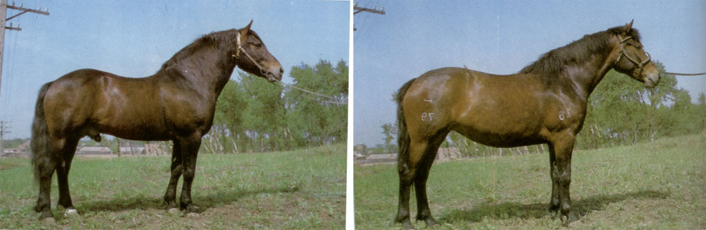 体质结实干燥,体型匀称优美,头中等大,多直头。颈略长于头,颈峰微隆,颈型优美,鬐甲适中,胸深宽,背腰平直,腹圆,尻正圆,略成复尻。四肢干燥结实,关节明显,蹄质坚实,距毛少,肢势正常。毛色以骝毛、黑毛为主,栗毛很少。 |