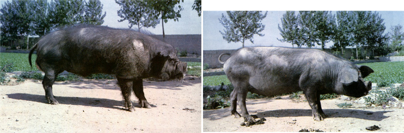 体型中等。头大小适中,额宽,有金钱形皱纹,耳中等大,耳根硬,耳尖向前倾罩,嘴筒短而微撅,颈部宽短,胸宽而深,背腰平直且宽,四肢结实。皮灰色,毛黑色,有“金钱顶,全身黑,罩耳朵,双脊背”之称。 |