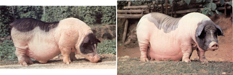 体型较小,具有头短,颈短,耳短,身短和尾短的特点,故有“六短”猪之称。额较宽,有“<>”形成菱形皱纹,中间有白班三角星,耳小向外平伸,背腰宽广凹下,腹大拖地,体长与胸围几乎相等。被毛稀疏,毛色为黑白花,除头、耳、背、腰、臀为黑色外, |