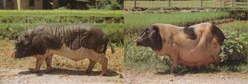 体型中等,头较小,额稍窄,面狭长直,耳略长,向上或向前伸,背微凹,臀稍倾斜,腹不拖地,四肢强健有力,体长大于胸围,被毛黑色白花,被要部分、有大小不定的黑斑,额前有白色流星,多延至鼻端。 |