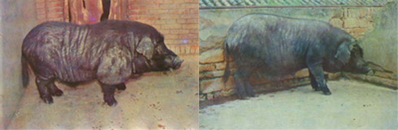 可分为大中小三型。大型称为“八卦头”,头大、耳大、腹大不下垂,身长、尾粗长、面部微凹,四肢粗壮;小型称为“狗头”或“油葫芦”猪,嘴筒细,尾细、耳小、身短、四肢细短;中型称为“羊头”或“二虎头”,介于大、小两型之间。被毛黑色居多。 |