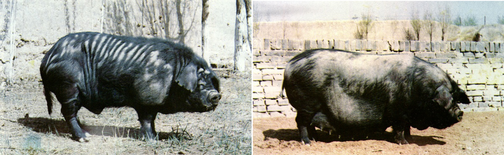 结构匀称,头大小适中,额宽有皱纹,嘴中等长而粗,面微凹。耳中等大,耳根较硬,稍向前倾而下垂。背腰平直宽阔,腹较大不下垂,臀宽稍倾斜,四肢健壮。被毛全黑。 |