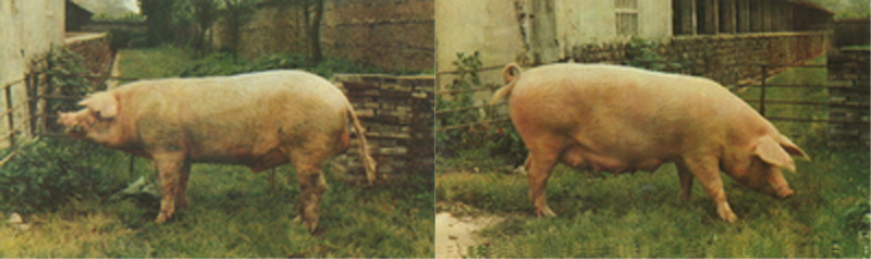 被毛全白,体型中等,头颈较轻,面部平直或微凹,耳中等大呈前倾或稍下垂,背腰较长,腹线较平直,腿臀肌肉丰满。 |