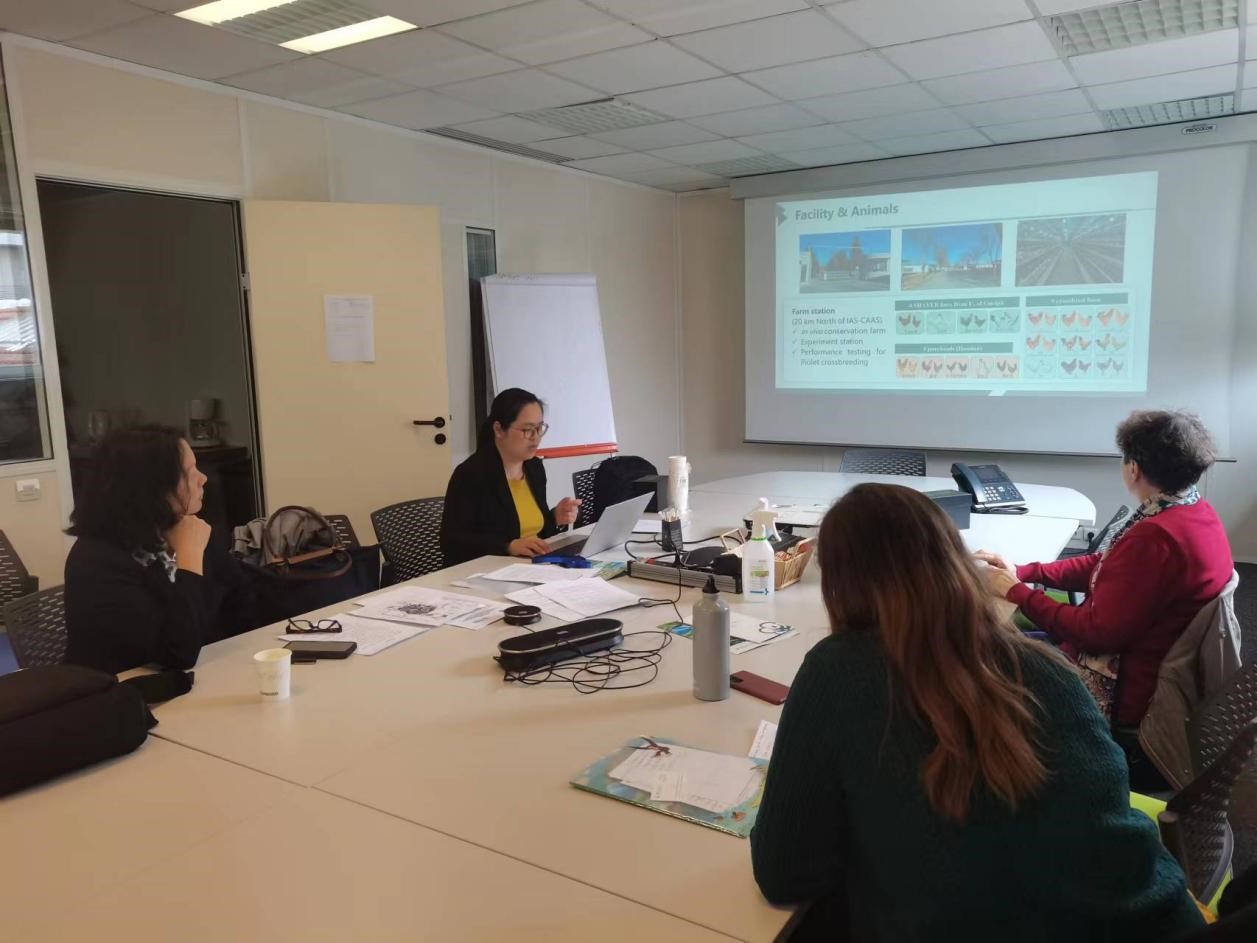与Michele Tixier Boichard教授和卢瓦尔河谷研究中心家禽生理和行为生理学系Anais Vitorino Carvalho副教授会谈期间,孙研研副研究员介绍家养库和所在团队最新研究进展。双方商议INRAE、巴黎萨克雷大学、图尔大学等与中国农业科学院北京畜牧兽医研究所人才交流和联合培养研究生协议签署办法,商讨中法联合实验室申报计划,讨论“中法科研伙伴交流计划”项目申报内容,双方签订引智项目工作协议,邀请法方相关专家分别于2024年7月和10月来访家养库。