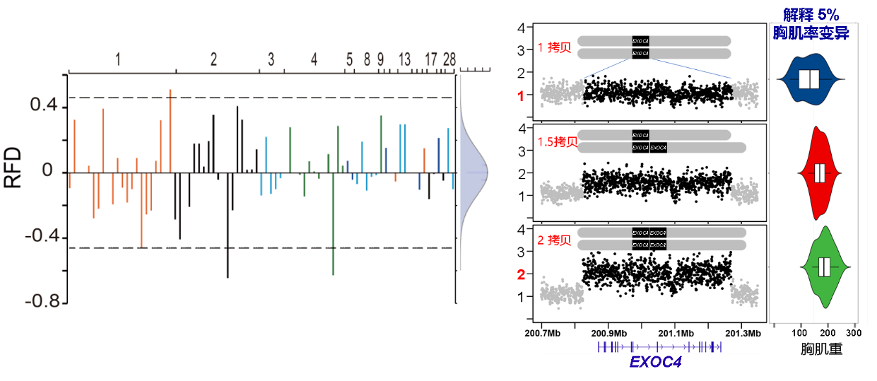 据团队首席周正奎研究员介绍,基于团队积累的北京鸭10个世代群体拷贝数变异关联分析,发现 EXOC4 基因多拷贝基因型在选育中频率逐渐增加,该CNV可解释1.90%的胸肌重变异, EXOC4 通过提高葡萄糖转运与胰岛素合成速率促进胸肌的发育(图1)。这是鸭上首个与经济性状显著相关的高置信结构变异的报道,不仅阐明了结构变异在肌肉发育中的作用机制,还为胸肌重选育提供了可靠的分子标记。研究同时发现,虽然受到了持续强烈选择,但是受选择的等位基因频率在第十世代群体中均没有被固定。基因组大数据科学解释了为何“畜禽育种如逆水行舟”,常规育种一旦放松选择或随机交配,优异等位基因频率将快速回落,目标性状也随之衰退,而分子育种则可以将优异等位基因在群体中快速纯合。相关研究成果发表在《GigaScience》。