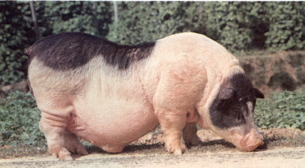 | 濒危依据及说明 | 体貌概述 | 体型较小,具有头短,颈短,耳短,身短和尾短的特点,故有“六短”猪之称。额较宽,有“<>”形成菱形皱纹,中间有白班三角星,耳小向外平伸,背腰宽广凹下,腹大拖地,体长与胸围几乎相等。被毛稀疏,毛色为黑白花,除头、耳、背、腰、臀为黑色外,其余均为白花、黑白交界处有4-5厘米的黑皮白毛的灰色带。 | |