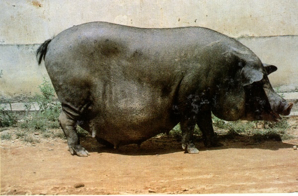 | 体型 | 体型略呈长方形。背腰微凹,腹部稍大,但不拖地,臀部较平直。四肢直立、坚实有力、长短适中,后退肌肉较丰满。 | 毛色 | 被毛黑色,部分猪的腕关节和跗关节以下为灰白色。 |