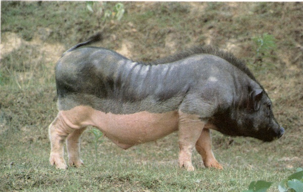 | 体型 | 体躯宽深短圆,背腰微凹,腹大,臀部较平,四肢较小。 | 毛色 | 头、背部并向左右延伸至体侧中部为黑色,体侧下半部、腹部和四肢均为白色。 |