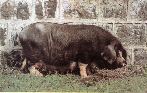 | 体型 | 颈较细,胸较宽,背腰多平直,腹下垂。四肢粗壮,大腿不够丰满。尾尖扁平。 | 毛色 | 毛色大体可分为三种,全身黑色,仅肢端,尾尖,额部有白斑者称“六白”猪,毛色六白;四蹄;大斑花三类。 |