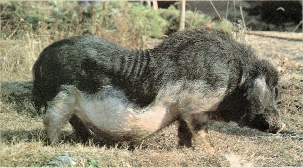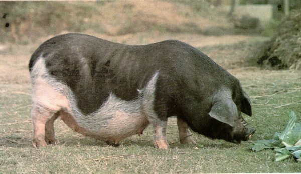 | 体型 | 颈粗短。肩宽,背腰平直,腹大呈弧形,臀欠丰满。四肢粗壮, | 毛色 | 除额部、尾尖、腹部和四肢下部等七处为白色外,其余均为黑色;也有少数腹部为黑色的。 |