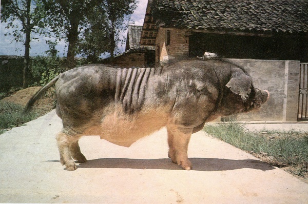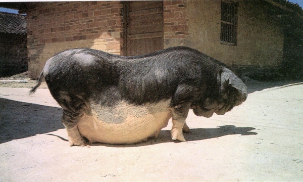 | 濒危依据及说明 | 体貌概述 | 体格中等,体质疏松。头大小适中,头型分“狮子头”和“狗头”两种,狮头猪的前额稍凹陷,嘴筒粗短,颜面皱纹多而深,又称“八卦脸”;狗头猪的嘴筒长直,颈也较长。耳中等大、下垂。背腰稍凹腹大。四肢粗圆,多卧系。鬃毛粗长。毛色为“乌云盖雪”,头部和背部呈黑色,腹部和四肢下端为白色,嘴尖粉红色,前额中央有一小撮白毛的叫“小花脸”,有一直条白毛的叫“大花脸” 。 | |