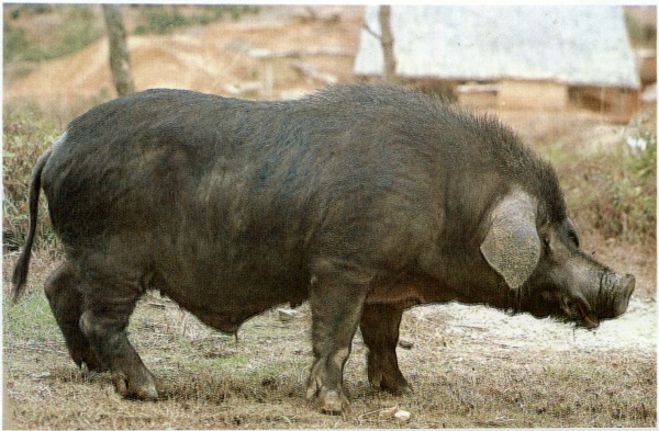 | 体型 | 颈短背宽,背腰平直或微凹,臀宽丰满。四肢较细且结实。 | 毛色 | 毛稀而短,被毛黑色,有的呈黑色,有的具有“六白”或不完全“六白”特征。 |