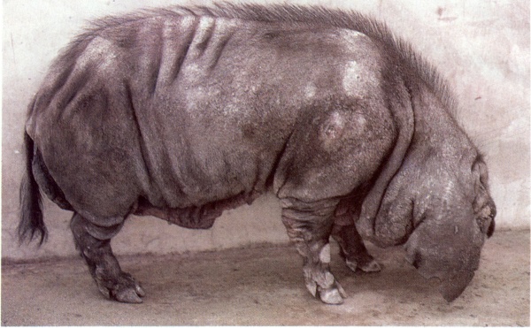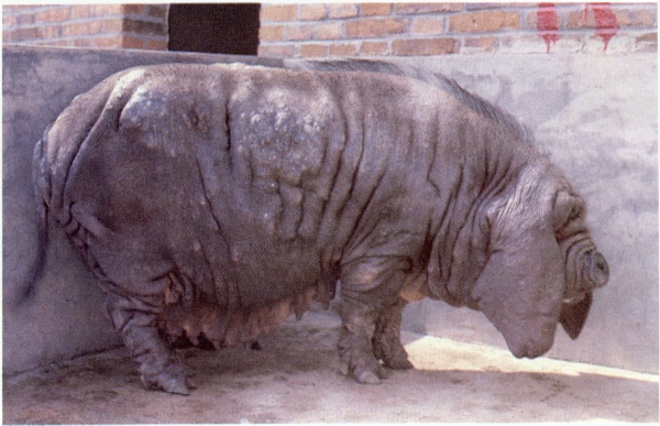 | 濒危依据及说明 | 体貌概述 | 体型中等,在类群间,梅山猪体型较大,骨骼较粗壮。头大额宽、额部皱褶多、深。耳特大,软而下垂。耳尖齐或超过嘴角,形似大蒲扇。全身被毛黑色或青灰色,毛稀疏,毛丛密,毛丛间距离大,腹部皮肤多呈紫红色,也有鼻吻白色或尾尖白色的,梅山猪的四肢末端为白色,俗称“四白脚”。 | |