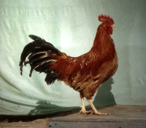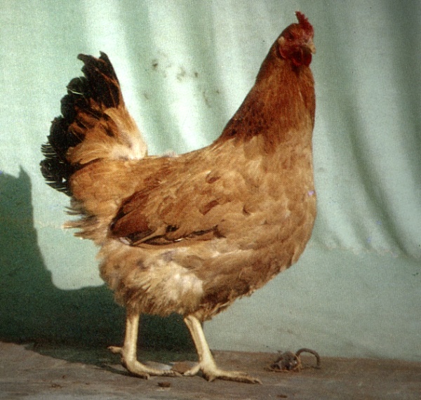 | 体貌概述 | 体型魁伟,胸深且广,背宽而长,腿高粗壮,腹部丰满,墩实有力,觅食力强,属兼用性鸡种。公鸡羽毛棕红色,尾羽黑色并带金属光泽。母鸡多呈麻黄色。头颈粗壮。眼大明亮。单冠。冠、耳叶、肉垂均呈红色。喙、胫趾均呈黄色。 | 体型 | 体型魁伟,胸深且广,背宽而长,腿高粗壮,腹部丰满 ,墩实有力,属兼用性鸡种。 |