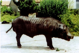 | 其他图片 | 体型外貌 | 里岔黑猪背长腰直,毛色全黑。头中等大,嘴筒长直,耳大下垂。腹平不拖地,乳头数7~9对。具有适应性强、繁殖力好、生长发育快、瘦肉率高、肉质鲜嫩等优良特性。还具有胸腰椎数比一般猪多l~2个的独特性状。其缺点是皮较厚,骨较粗,后躯欠丰满。 后备猪8月龄体重114.1日千克,体长131.9日厘米,成年猪体重175.37千克,体长162.58厘米。 6月龄体重达80千克左右时,公猪精子已经成熟,母猪开始规律性发情,发情周期为18~21天,发情持续期为3~5天,发情征状明显。体重在19.88~92.35千克肥育期间,日增重624.14克,屠宰率72.31%,瘦肉率50.88%。肉质检测结果:肉色3.8,大理石纹2.87,pH6.24,瘦肉率68.83%,失水率16.35%,肌肉嫩度3.89。以里岔黑猪为母本,分别与杜洛克、汉普夏、长白、大约克公猪杂交,所得二元杂交一代猪的育肥性能,达到了以我国多数地方猪种为母本的二元杂交猪的水平,日增重达700克以上,瘦肉率达55%以上,料重比在3.5:l以下。以杜里杂交为母本与长白或大约克公猪杂交所得三元杂交一代猪的日增重达800克以上,瘦肉率58%以上,料重比3:1以上。 | |