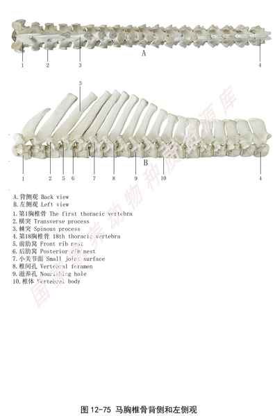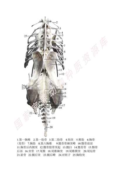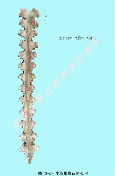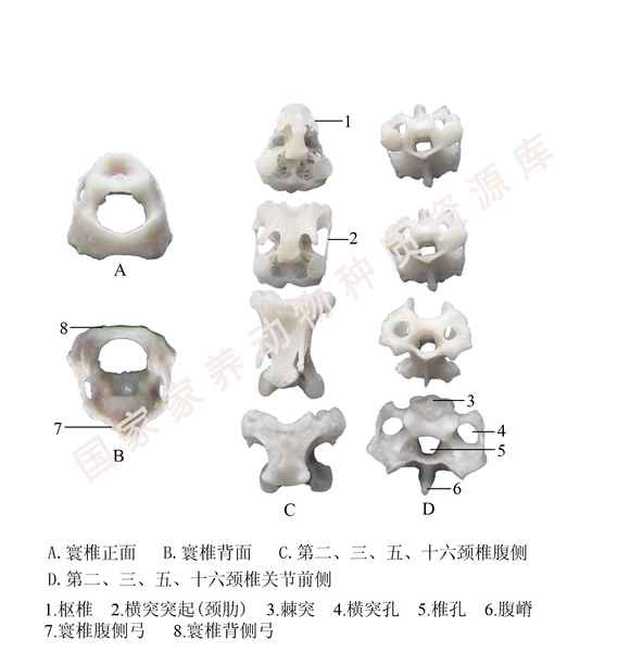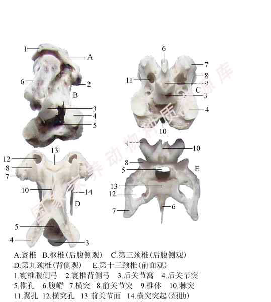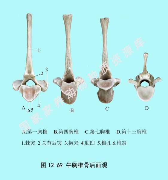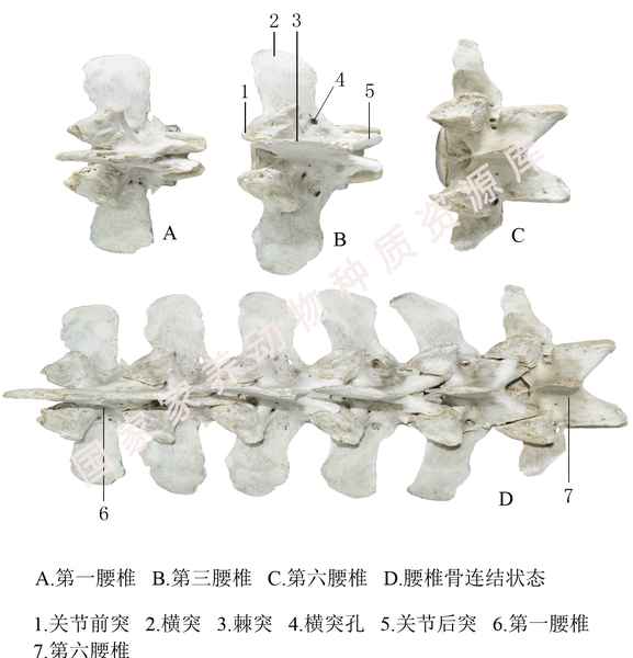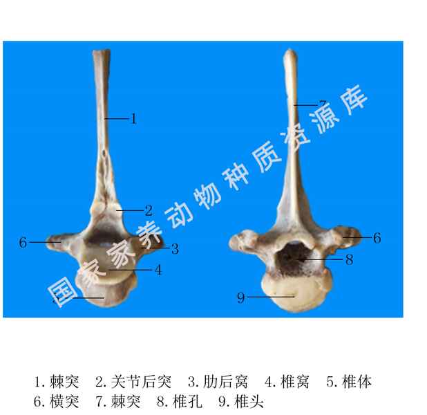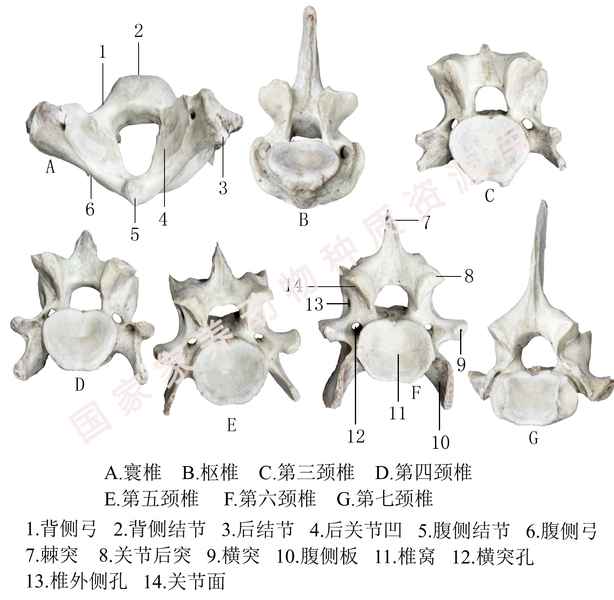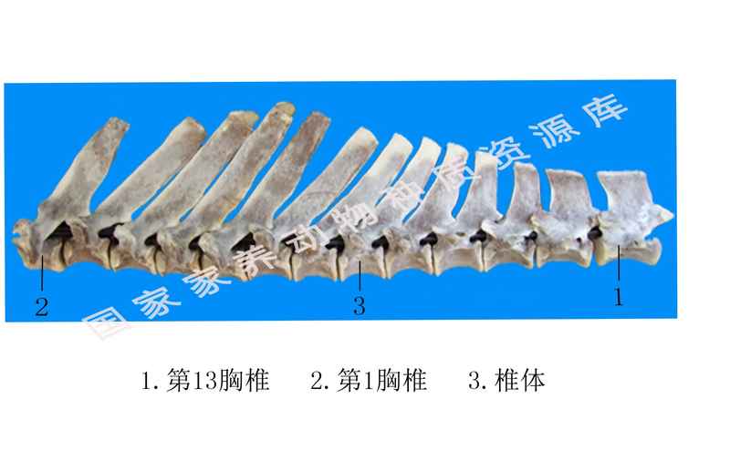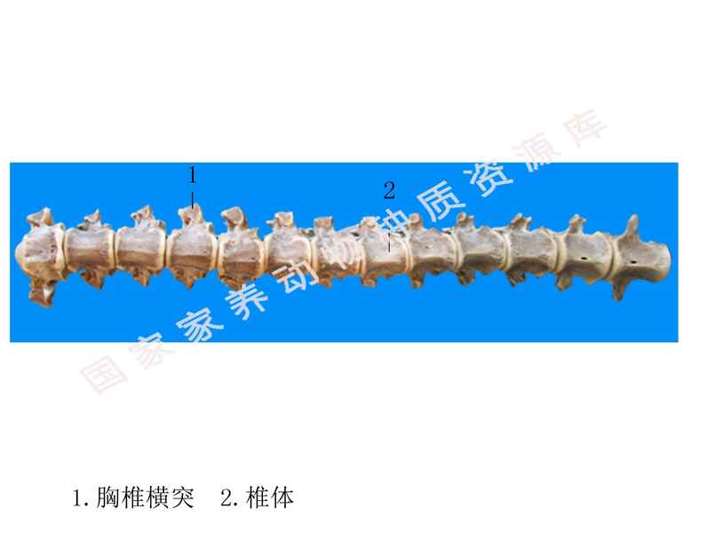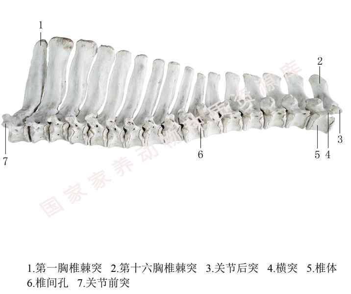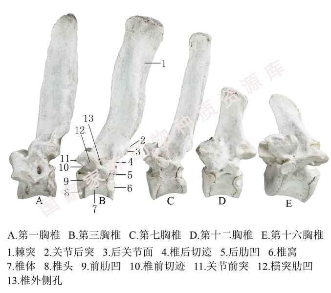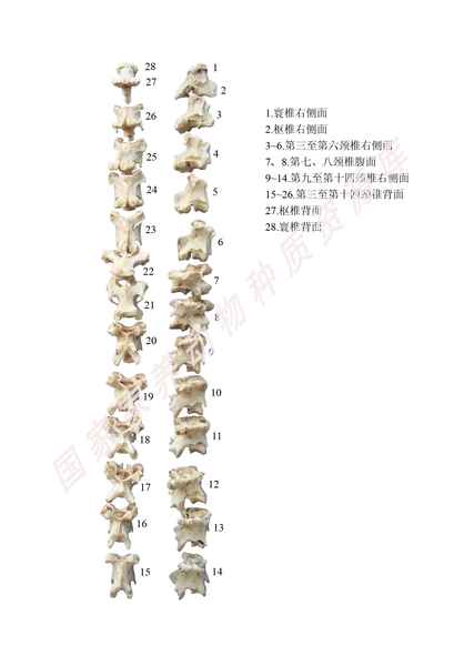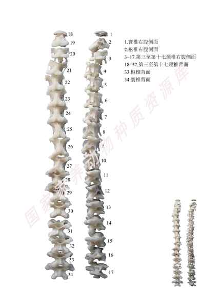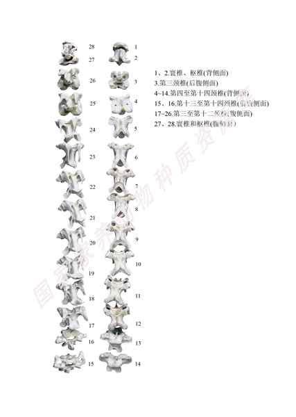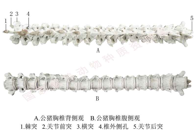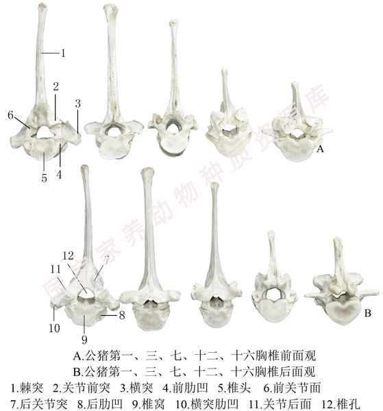 公猪第1、3、7、12、16胸椎骨前、后面观